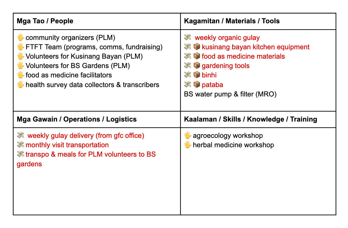 Weekly Kusinang Bayan. Nanay volunteers from PLM prepare healthy meals for their community, from fresh & organic vegetables grown and shared by organic farmers who have been working with Good Food Community.On-site Public Health Survey. We interview households and distribute health survey forms.The gathered data is used to design programs that cater to urgent health needs and work with the nearest community health center.Monthly FTFT Volunteer Visits. We conduct monthly visits with volunteers to participate in the Kusinang Bayan. Each visit includes an orientation about the place on certain economic affairs that determine their situation with regards to housing, land, and issues about food. FTFT collaborates with partners on the ground to conceive training programs like cooking demos or talks, prepared by either volunteers or locals.Food as Medicine Program. A series of workshops and discussions on the role of food in healing our bodies. This is a dialogical program, with locals giving their inputs, designing their own modules and eventually leading in other sessions, recalling indigenous foodways and other traditional modes of healing.